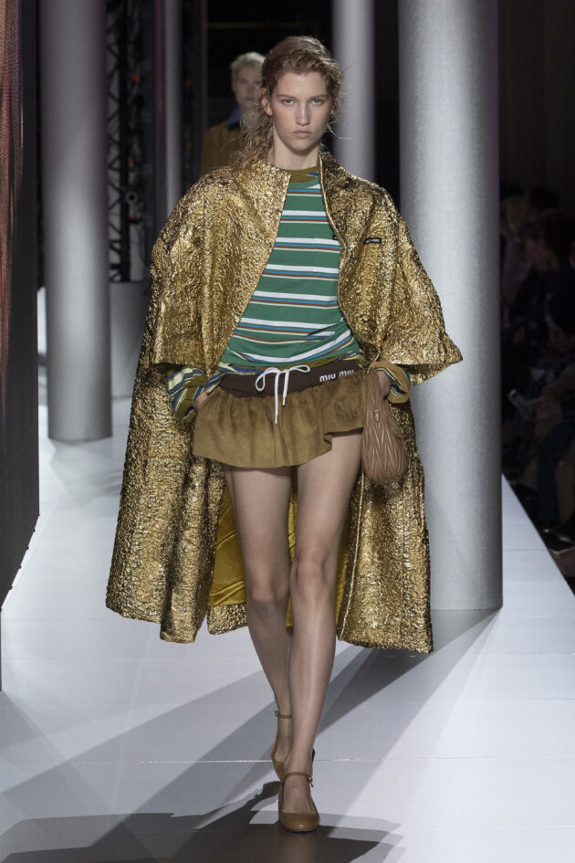E ciò che rende questa collezione straordinaria è il proprio modo in cui si fonde il passato con il presente: “La storia è importante”, chiosa la designer. “Gli abiti stessi portano le tracce della vita, mostrando segni di lavaggi, strappi e materiali segnati dal tempo. Questi dettagli sono un omaggio all’usura e all’amore che questi capi hanno vissuto nel corso degli anni”, sottolinea ancora Miuccia Prada che in Miu Miu esprime la sua anima più profonda dando libero sfogo alla sua linfa creativa. Così, ecco lavaggi, strappi, scamosciati e pelli segnate, un’amplificazione del passare del tempo che è espressione di uso precedente, di amore re-sistente.