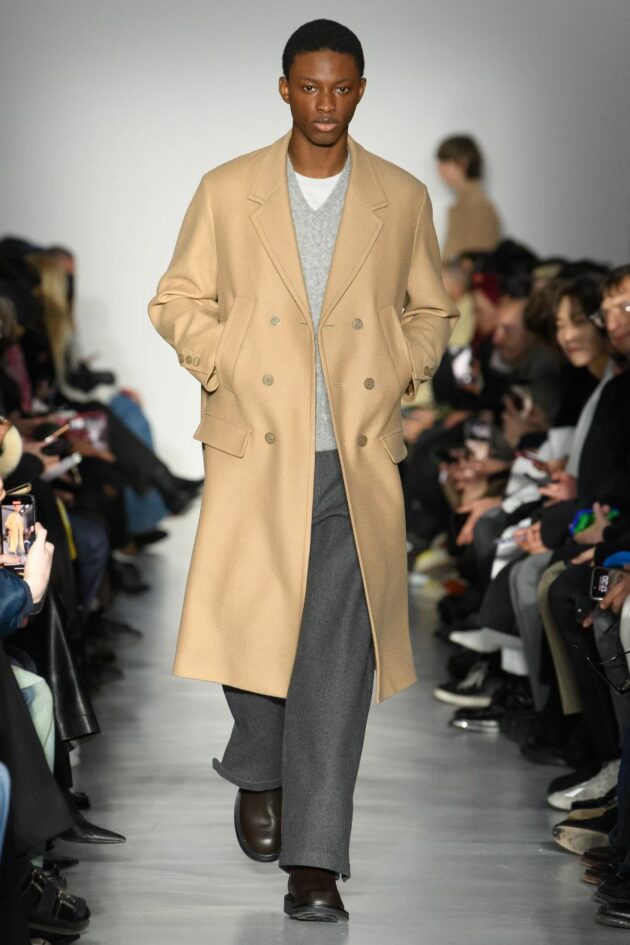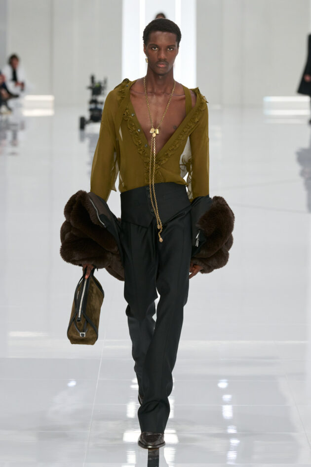 Neil Barrett rilegge invece il tradizionale guardaroba maschile attraverso dettagli innovativi e materiali sperimentali. Nella collezione autunno/inverno 24-25 dello stilista inglese, i capispalla si fanno ibridi a metà tra formale e sportswear, le maglie divengono sottilissime e preziose o super classiche, da indossare semplicemente sopra t-shirt candide e morbidi cinque tasche in denim e infine il tradizionale Harris tweed si trasforma in un Techno tweed di nuova generazione. Un guardaroba perfetto per l’uomo del ventunesimo secolo sempre in continua evoluzione.