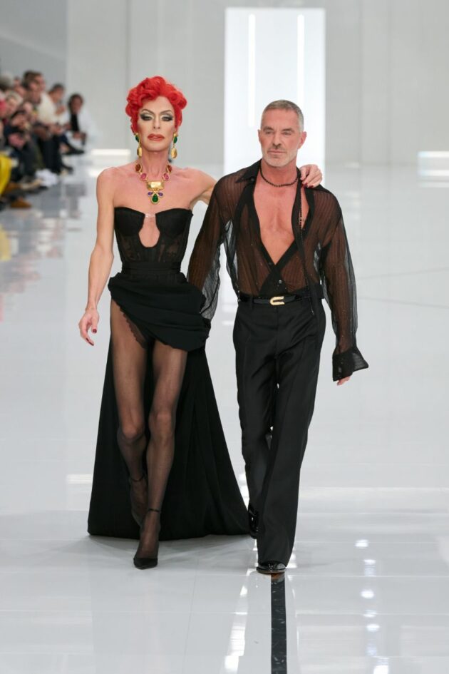 Celebra invece la diversità e l’unicità la collezione autunno/inverno 24-25 di DSquared2. Dean e Dan Caten con una sfilata co-ed in cui i capi uomo e donna appaiono gli uni accanto agli altri, presentano un racconto autobiografico che diventa un inno alla libertà. In uno spazio bianco che ricorda una clinica asettica, i due stilisti fanno sfilare 15 coppie di gemelli uomini e 9 coppie di gemelle. Come due alchimisti i Caten orchestrano trasformazioni e metamorfosi: ai modelli in stile grunge con indosso camicie scozzesi, felpe, bermuda e jeans si alternano i loro gemelli elegantissimi in completi sartoriali, camicie di chiffon e pantaloni in paillettes. E poi un grand finale a sorpresa in cui i fratelli Caten escono in passerella a raccogliere gli applausi: Dan in camicia trasparente e pantaloni neri e Dean in versione drag con un corsetto e una lunga gonna con strascico.