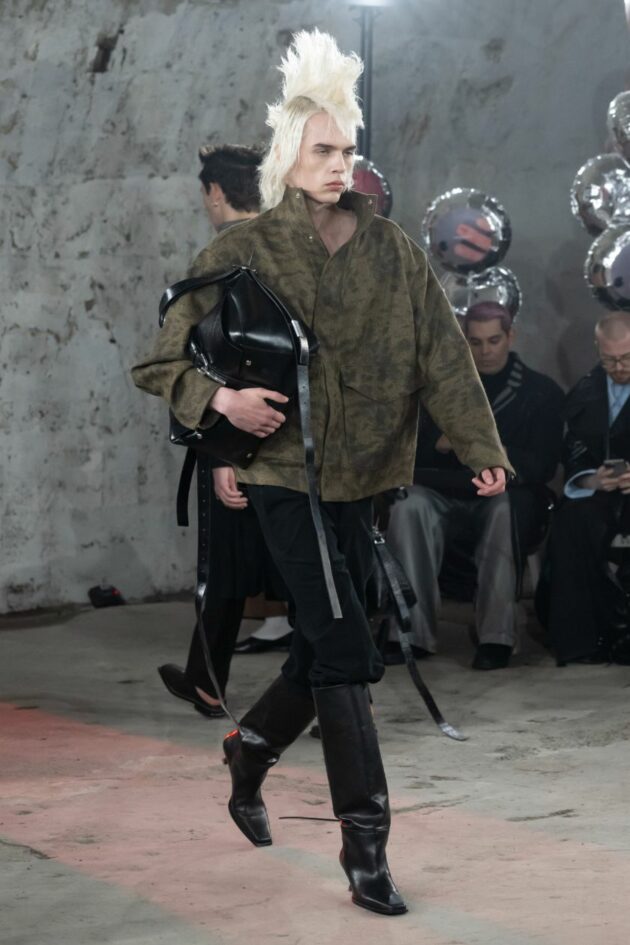 JordanLuca, il marchio disegnato dal talentuoso duo composto da Jordan Bowen e Luca Marchetto, rilegge la tradizione sartoriale di Savile Row e quella italiana alla luce delle subculture inglesi. Nei Magazzini Raccordati della Stazione Centrale di Milano, in un lungo tunnel decorato con palloncini ad opera dell’artista Dominic Myatt, prende vita una collezione che racconta i tempi difficili che stiamo attraversando. Le giacche rigorose hanno aculei in metallo al posto dei bottoni, le maglie diventano miniabiti e sono usurate dal tempo, i bomber evidenziano silhouette dalle spalle ricurve e infine i trench scelgono la sensualità e il mistero del vinile.