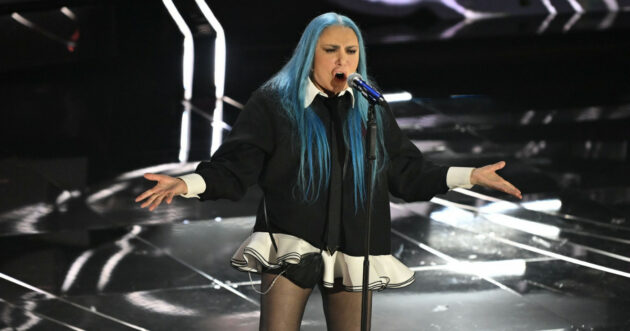 La Sad punk nell’anima – Creste fluo, petto nudo con tatuaggi in vista e corsetto metallico che ricalca una cassa toracica. Sono punk nell’anima e teneri nel cuore. Grinta e personalità, ci piacciono. Voto 8.