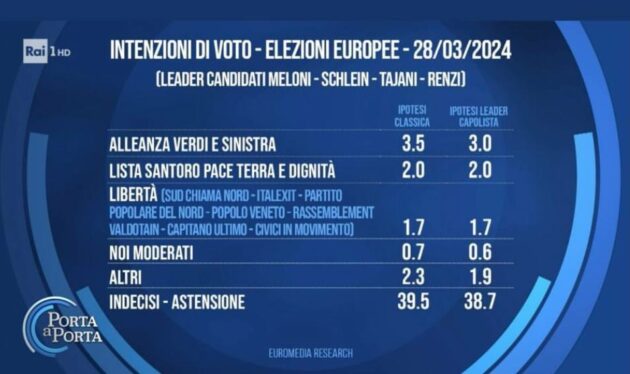 Dentro la lista Stati Uniti d’Europa, dentro Azione, fuori l’Alleanza Sinistra-Verdi, fuori la lista Pace Terra e Dignità di Michele Santoro. A poco più di due mesi dalle elezioni europee, oltre ai rapporti di forza tra i partiti più grandi e gli schieramenti, quello che comincia a contare è se e quali forza politiche riusciranno a superare la soglia di sbarramento nazionale per entrare al Parlamento europeo, fissata al 4 per cento. E grazie agli accordi degli ultimi giorni a spuntarla, secondo l’ultimo sondaggio di Euromedia Research diffuso durante Porta a Porta, sarebbero i cartelli elettorali guidati da Matteo Renzi e Carlo Calenda. Bisogna tra l’altro sottolineare che l’istituto diretto da Alessandra Ghisleri ha provato a sperimentare due diverse rilevazioni per ciascun partito, cioè se si presentasse o se non si presentasse il leader come candidato capolista: ebbene, le differenze sono quasi impercettibili (l’unico fenomeno anomalo riguarda proprio Avs, che senza leader “visibili” va meglio).
