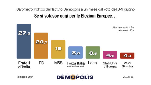 Fratelli d’Italia “congelato” intorno al 27 per cento. Il Pd che torna a vedere il 21, valore intravisto solo nella settimana post-Sardegna. Stati Uniti d’Europa e Verdi-Sinistra favoriti su Azione e Libertà nella conquista della soglia di sbarramento. A un mese dalle elezioni europee il Barometro Politico di Demopolis fa il punto sul consenso dei partiti. Il primo partito resta Fdi col 27,2: lo scorso mese, sempre secondo Demopolis, era al 27, mentre il calo è netto rispetto a fine febbraio quando il partito della presidente del Consiglio era ancora al 28. A inseguire è il Pd, distante 6 punti e mezzo: è al 20,7 per cento (contro il 20 netto di un mese fa e il 20,8 di fine febbraio). La terza forza è ancora il M5s che l’istituto diretto da Pietro Vento valuta al 15 per cento, in calo sia rispetto ad aprile che rispetto a fine febbraio (quando aveva rispettivamente il 15,8 e il 17). Il Movimento, scrive Demopolis nel suo breve report, è “alle prese con la complessa sfida di mantenere il proprio consenso senza la presenza in lista di Conte e dei suoi esponenti più noti”.