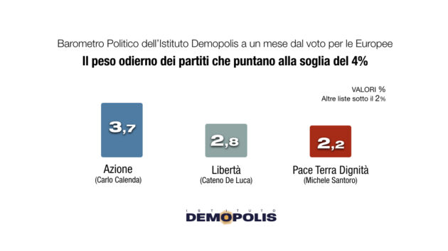 E poi c’è la corsa per raggiungere il 4 per cento, la cifra minima per ottenere rappresentanti all’Europarlamento. Stati Uniti d’Europa – che unisce Italia Viva, +Europa, Psi e altre sigle minori – otterrebbe il 4,6 per cento (stabile rispetto ad aprile), mentre Alleanza Verdi Sinistra il 4,3% (in trend positivo rispetto ai mesi scorsi: +0,5 in un mese). Sarebbero subito sotto il 4 invece Azione (3,7, percentuale da cui non si schioda da mesi) e Libertà (la “lista delle 19 liste” guidata da Sud chiama Nord di Cateno De Luca è al 2,8). Più indietro Pace Terra Dignità di Michele Santoro il 2,2 per cento.