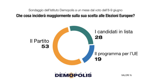 Cosa influenza di più la scelta degli elettori? Secondo Demopolis la preferenza è dovuta in gran parte al partito, risposta selezionata dalla maggioranza assoluta degli intervistati. Una parte significativa si interessa anche ai candidati in lista (28 per cento), mentre una parte minore guarda al programma (19).