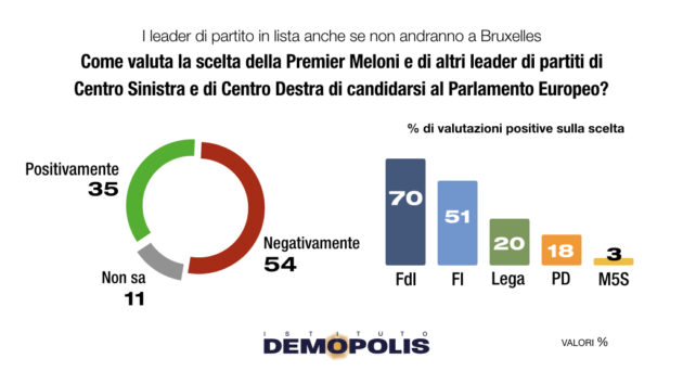 Ha un impatto sul consenso la presenza dei leader in lista, su cui si è acceso un dibattito in particolare nel Partito democratico. Fratelli d’Italia, per esempio, secondo Demopolis guadagna due punti percentuali grazie alla candidatura di Giorgia Meloni, mentre un minore impatto è registrato per effetto delle candidature di Elly Schlein e Antonio Tajani che fanno guadagnare circa mezzo punto a Pd e Forza Italia.