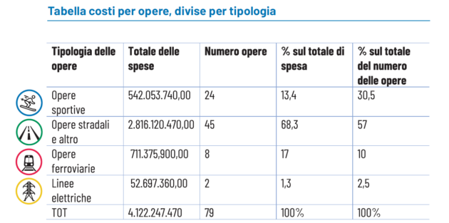 PER LE STRADE IL 68 PER CENTO – Interessante l’analisi della tipologia di interventi. Per le 24 opere sportive, essenziali allo svolgimento delle Olimpiadi (pista da bob, palazzetti, piste…), i 542 milioni di euro equivalgono al 13,4 per cento della spesa e al 30,5 per cento del numero di opere. La fetta maggiore va alle 45 opere stradali: assorbiranno 2,8 miliardi di euro, il 68,3 per cento della spesa e il 57 per cento del numero totale. Le opere ferroviarie (8) impiegheranno 711 milioni, il 17 per cento della spesa totale. Le due linee elettriche incidono per 53 milioni di euro, l’1.3 per cento della spesa. In Lombardia, delle 41 opere, 14 sono sportive (187 milioni), 25 stradali (1,3 miliardi di euro), 2 ferroviarie (450 milioni). In Veneto sono previste cinque opere sportive (216 milioni), ma la parte maggiore è costituita dalle 5 opere stradali (1,1 miliardi) che assorbono l’80 per cento di tutti i soldi spesi in regione. Anche in provincia di Bolzano la spesa maggiore riguarda le 11 opere stradali (238 milioni di euro, pari al 55,5 per cento), mentre le opere sportive con 48 milioni sono solo l’11,5 per cento della spesa, quelle ferroviarie il 32 per cento (138 milioni). In provincia di Trento le quattro opere sportive per 90 milioni raggiungono il 23 per cento del totale, le quattro opere stradali (189 milioni) invece il 48 per cento e quelle ferroviarie (66 milioni) il 17 per cento.