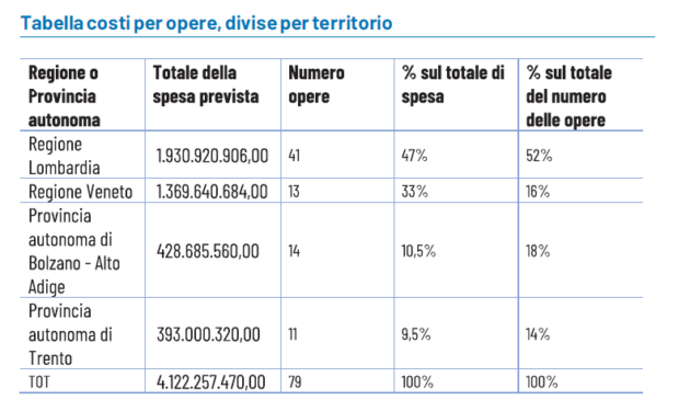 ALLA LOMBARDIA LA FETTA MAGGIORE – Da sola la Lombardia spende quasi la metà dei soldi. Si tratta di 1,9 miliardi per 41 opere, pari al 47 per cento del totale di spesa (il 52 per cento delle opere). In Veneto la spesa è di 1,4 miliardi per 13 opere, il 33 per cento della spesa totale e il 16 per cento delle opere. La Provincia Autonoma di Bolzano spenderà 428 milioni, per 14 opere, il 10,5 per cento della spesa e il 18 per cento delle opere. La Provincia Autonoma di Trento spenderà 393 milioni per 11 opere, pari al 9,5 per cento della spesa e al 14 per cento delle opere. Sulle spese del Veneto incidono soprattutto la variante di Longarone e la variante di Cortina d’Ampezzo (quasi un miliardi) che forse non saranno nemmeno cantierizzate prima dei Giochi.