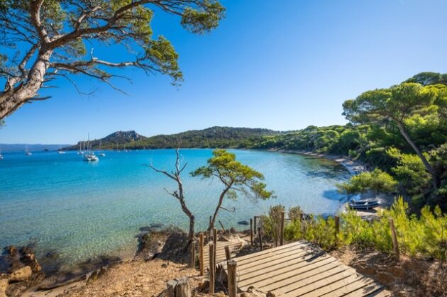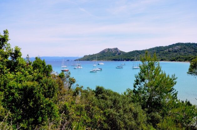 Basta un quarto d’ora di navigazione col traghetto che salpa dal porto di Giens – La Tour Fondue, per raggiungere Porquerolles, isola eco-chic, la più grande dell’arcipelago di Hyères, di cui fanno parte Port Cros e l’Ile du Levant (chiamate anche isole d’Oro). Così autentica e speciale, enclave un tempo di intellettuali come George Simenon e Paul Valéry, è oggi il luogo perfetto per chi vuole immergersi in una natura incontaminata, protetta da rigide norme ambientali, volte alla salvaguardia di questo territorio piccolo ma prezioso. Le auto sono vietate (tranne quelle poche dei residenti) e non ci sono mezzi pubblici. Il modo migliore per spostarsi è andare in bicicletta da noleggiare in uno dei tanti negozi sull’isola. Incorniciata da minuscole casette color pastello, Place d’Armes (proprio qui da L’Indien abbiamo preso le nostre bici) è il cuore del villaggio, l’unica piazza dove i pochi abitanti dell’isola giocano a pétanque e dove il massimo della mondanità è sedersi in uno dei bar all’aperto e sorseggiare un pastis come aperitivo. Il paesaggio verace e il douceur de vivre di cui godiamo oggi sono quasi interamente attribuibili a un cercatore d’oro belga, FJ Fournier, che acquistò Porquerolles nei primi anni del 1900 per farne regalo alla sua nuova moglie; fece piantare 500 acri di vigneti che produssero uno dei primi vini provenzali, le vin des Côtes de Provence. Nel 1971 lo stato intervenne e dichiarò l’80 percento dell’isola un parco nazionale. Lungo la costa settentrionale, spiagge di sabbia bianca e foreste di pini marittimi (si possono raggiungere seguendo facili sentieri anche a piedi) che arrivano fino nel mare azzurrissimo. Una delle più belle è Plage de Notre Dame, senza dimenticare Plage d’Argent, una fine lingua di sabbia di quarzo bianco su cui si affaccia un chiosco. In sella ci siamo spinti fino a Plage du Langoustier, palma d’oro per bellezza e esprit sauvage con Plage de la Galère.