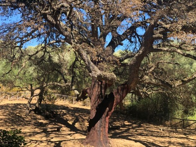 A partire dal XVIII secolo, la Basilica ha ottenuto il privilegio di avere la porta Santa, che così come a San Pietro nel Vaticano viene aperta ogni sette anni, per un anno intero, per offrire l’indulgenza plenaria ai numerosi pellegrini che vi si recano. Qui, abbiamo incontrato Tonino, di 94 anni. Si alza la mattina presto e va in campagna a zappare il suo orto. Fa 5 km a piedi in andata e altrettanti per tornare. Mangia genuino ortaggi, verdure, frutta di produzione propria e beve un bicchiere di rosso al giorno, allungato con un po’ d’acqua. Racconta del suo duro lavoro nei campi, della sua famiglia, dei bei tempi quando tutto andava meglio. Tonino è “di casa” dai giovani imprenditori del wine bar DiVinum di Luogosanto, che si sono impegnati a promuovere il territorio con prodotti di qualità, biologici e il loro terrazzino di campagna in paese è zeppo di stranieri. Come lui, in questa parte della Sardegna, ci sono persone con età da record, centenari più che altrove…è una zona chiamata Blue Zone ma alimentazione e stile di vita attivo non spiegano tutto, o quanto meno non sono una prova. Ma 500 anni li ha Il sughero di Crisciuleddu (quasi 4 metri di circonferenza e 20 di altezza, nell’elenco delle piante monumentali d’Italia), rivela Vittoria Fresi di Mediterranea Adventures che con il marito Telemaco Murgia porta i turisti in lungo e in largo alla scoperta di una Sardegna sconosciuta, specie fuori stagione, lontano dalla mondana Costa Smeralda. In cima al paese, l’Eremo di San Trano, da cui si vede bene la Corsica e la Maddalena.