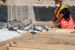 Pachi, Greece, October 2020. The sea bass is dropped, after being extracted from the farm cage, in plastic tanks filled with ice, which is designed to kill the fish instantly through temperature shock, although it doesn’t. The tanks are covered with lid