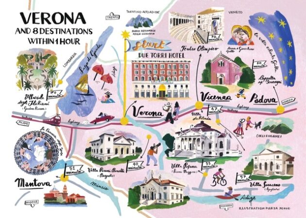 Spiccano il Grand Hotel Majestic “già Baglioni” di Bologna, il Due Torri Hotel di Verona, l’Hotel Bernini Palace di Firenze e l’Hotel Bristol Palace di Genova: ambasciatori dei loro territori, raccomandano speciali tour nel cuore delle proprie città. Gli hotel sono i punti di partenza ideali di un percorso fattibile, mappe di un territorio ricco di punti di interesse, a volte conosciuti, spesso meno noti a un pubblico internazionale. Proprio come i Libri della Buonanotte editi da Minerva, un’esclusiva Duetorrihotels che gli ospiti trovano nelle loro camere, sono destinati ad accompagnare l’esperienza di soggiorno ed essere portati a casa. In un’epoca devota al digitale le mappe sono un ricordo tangibile, da aprire, consultare e ripiegare, realizzate a mano colorate con acquerelli e tempera, ricche di dettagli.