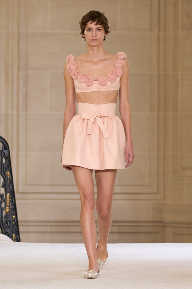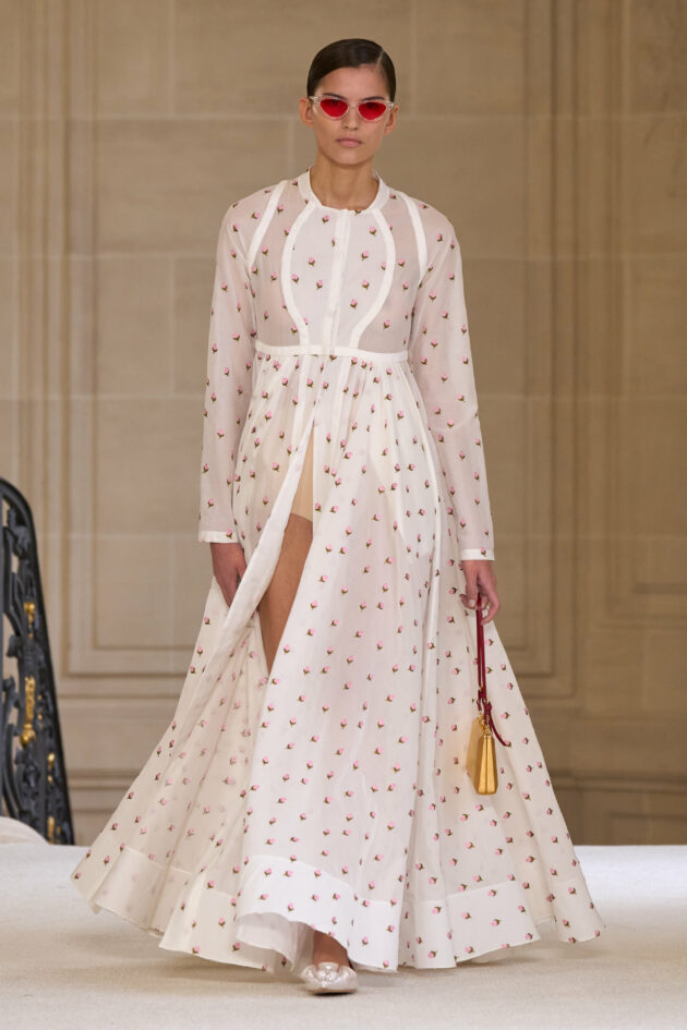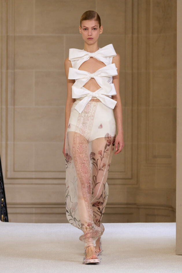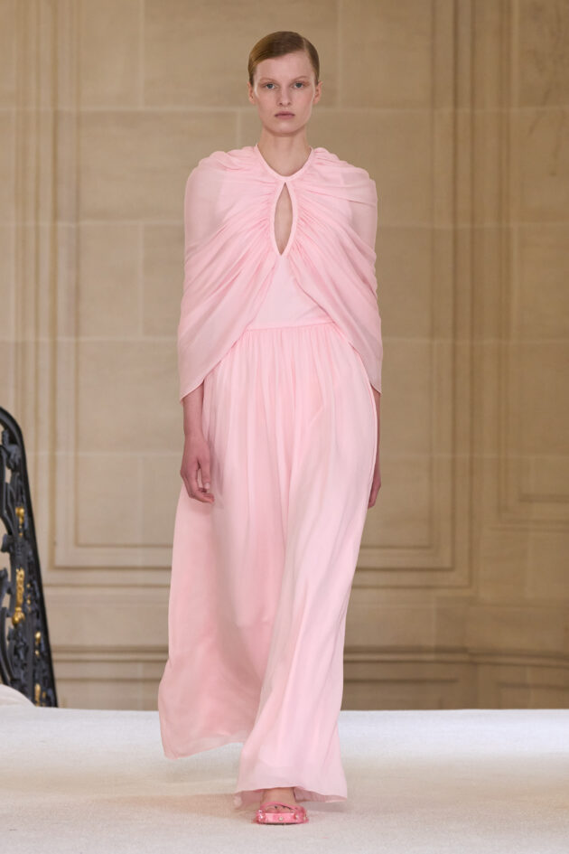 Come succede anche con Giambattista Valli, che per la prossima Primavera/Estate ha archiviato i maxi volumi e i tulle iconici rievocando piuttosto un giardino incantato, dove i fiori sbocciano in mille sfumature di rosa, lilla e verde menta, e le donne fluttuano come ninfe in abiti di chiffon e organza. Ci sono i fiocchi, le rose e le balze; ma tutto è etereo ed essenziale: “Voglio andare nella profondità del mio lavoro. A partire dallo studio delle relazioni tra leggerezza e peso, guardando al futuro”, sottolinea lo stilista romano che invita cosi’ a riflettere sul paradosso dell’esistenza, tra libertà e responsabilità, effimero e permanenza. Ispirandosi a “L’insostenibile leggerezza dell’essere” di Milan Kundera, Valli esplora la dualità tra la grazia eterea degli abiti e la ricchezza dei dettagli, tra la delicatezza dei colori pastello e la forza delle silhouette, lavorando anche lui per sottrazioni. La leggerezza è il filo conduttore che unisce tutte le creazioni. Abiti lunghi e fluttuanti in mussola, tuniche da vestale che accarezzano il corpo, micro-abiti che avvolgono come un soffio di vento. Le trasparenze giocano con la sensualità, lasciando intravedere la lingerie. È una leggerezza consapevole, che si interroga sul senso della vita, sulla ricerca di un equilibrio tra la gioia e il vuoto esistenziale. Ci invita a “navigare tra i due estremi”, come dice lo stilista, a trovare la nostra strada in un mondo in continuo cambiamento.