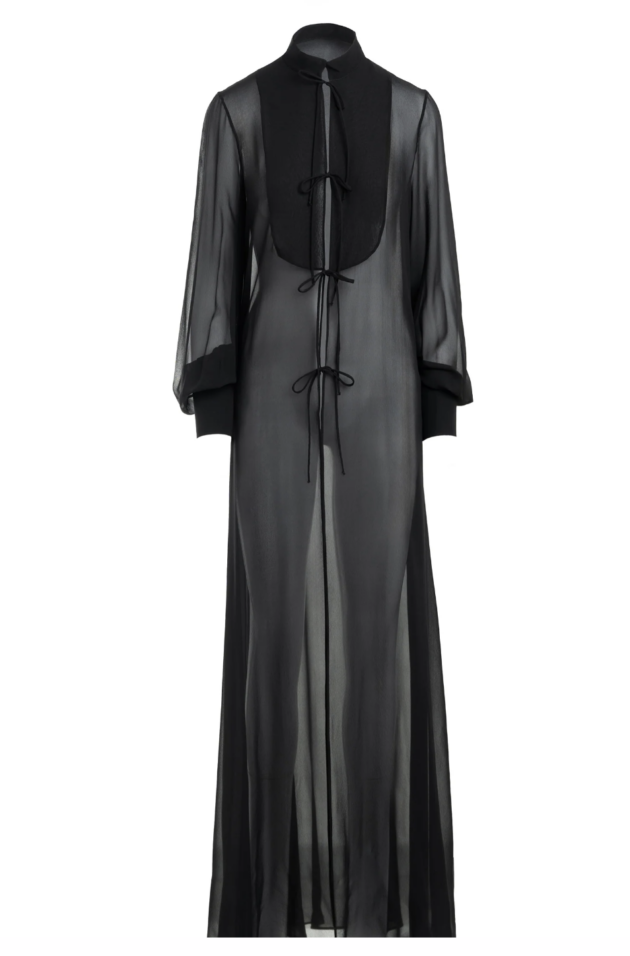 È qui che l’eleganza borghese diventa erotica. Trasparenze, chiffon e tulle non possono mancare nel guardaroba invernale. Un capo indispensabile per i look serali è un abito chemisier in seta, total black e da indossare con una lingerie elegante, con un body e perfino in layering sopra top e pantaloni.