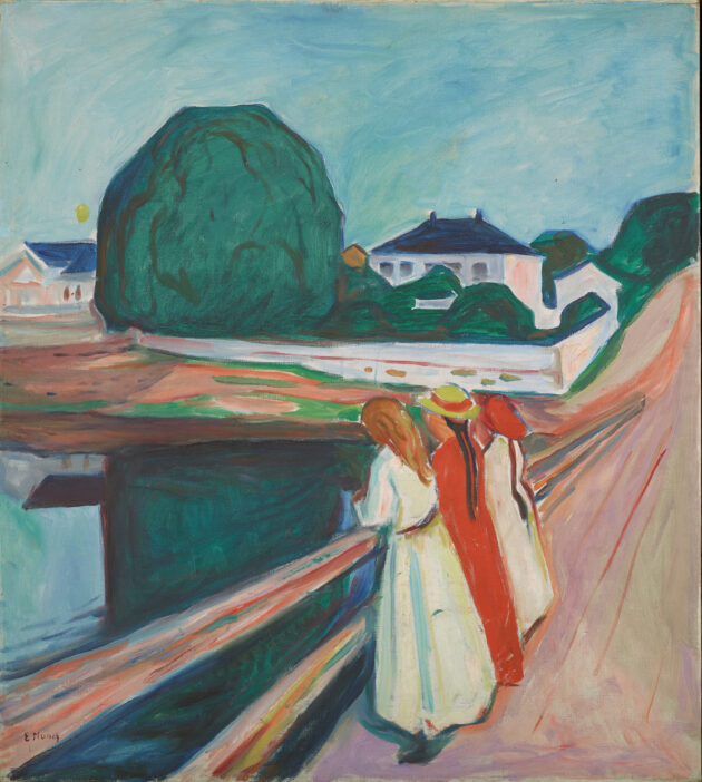 Il “grido interiore”, fulcro del titolo italiano della mostra, nella versione inglese della Berman diventa inner fire, fuoco interiore. Munch si autoritrae tra le fiamme del “fuoco della vita” mentre cerca il senso del suo inferno sulla terra: il pubblico è chiamato ad andare oltre il muro degli stereotipi di pittore maledettamente solo, alcolizzato, malato, vittima di quel connubio arte-vita in cui è finita per risolversi la sua produzione. La scelta dell’immagine-guida della mostra testimonia questo cambiamento di visione e restituisce la visione di un genio che ha trovato sollievo al suo male di vivere nell’arte, nella medicina, nel mare. Le ragazze sul ponte (1927) sono l’opera di un pittore che cerca il sole dentro: a fianco di quelle giovani donne Munch guarda la vita scorrere sotto i suoi occhi e aspetta l’istante in cui l’amore e la vita rompano gli argini.