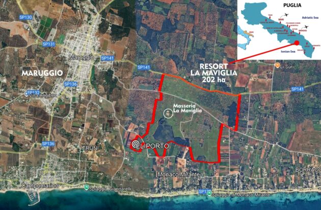 Potrei fare tutto questo, ma voglio invece concentrarmi sul progetto in sé. Il progetto della masseria è più grande dello stesso abitato di Maruggio, e prevede: 70 suite, 20 camere, 35 ville, una spa da 5mila metri quadrati e un campo da golf a 18 buche (e l’acqua per irrigarlo?). Un’operazione extra lusso come già si sono viste in Puglia, tipo la Masseria Pettolecchia o l’Hotel Vista Ostuni. Operazioni destinate quindi a una elite, completamente sganciate dal territorio in cui atterrano, e che trovano altri esempi similari anche in altre parti d’Italia, come il mega resort di Torno sul Lago di Como o quello di Antognolla, in Umbria, oppure ancora quello che si voleva realizzare all’isola Palmaria, di fronte a Portovenere e travolto dal Liguria-gate con relativo sequestro.