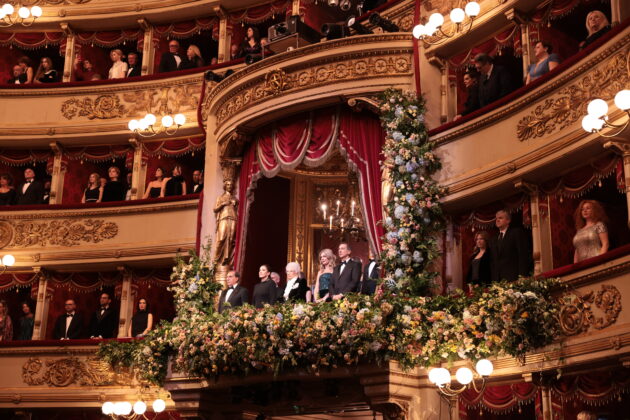 La “zona rossa” istituita attorno al teatro, sotto la pioggia incessante, in previsione di annunciati disordini (divinati anche dal sindaco Sala) è stata un invito imperdibile per collettivi e centri sociali, che hanno mimato un attacco con qualche bomba carta e un paio di fumogeni, ma senza neppure tentare di sfondare il cordone di polizia. Sono riusciti però a dare, prima che tutto iniziasse, un segnale simbolico fuori dal teatro, abbastanza in linea con la scenografia cupa sul palcoscenico: hanno cosparso letame sul red carpet e sui ritratti di quelli che considerano i signori della guerra: il premier israeliano Benjamin Netanyahu, ma anche Giorgia Meloni e Matteo Salvini.