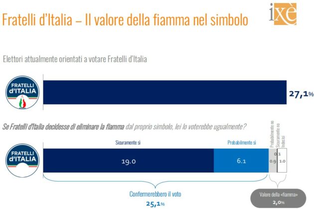 Ixè ha aggiunto un quesito al suo Osservatorio di dicembre, destinato ai soli elettori di Fratelli d’Italia. In queste settimane infatti nel partito di maggioranza relativa si è dibattuto molto dell’eventualità di rimuovere la fiamma tricolore dal simbolo. I dati dell’istituto triestino dicono che sostanzialmente l’elettorato di Fdi rimarrebbe quasi immutato: tra chi sostiene il partito meloniano il 19 per cento lo voterebbe sicuramente, il 6 “probabilmente”. Solo lo 0,1 per cento risponde “sicuramente no”.