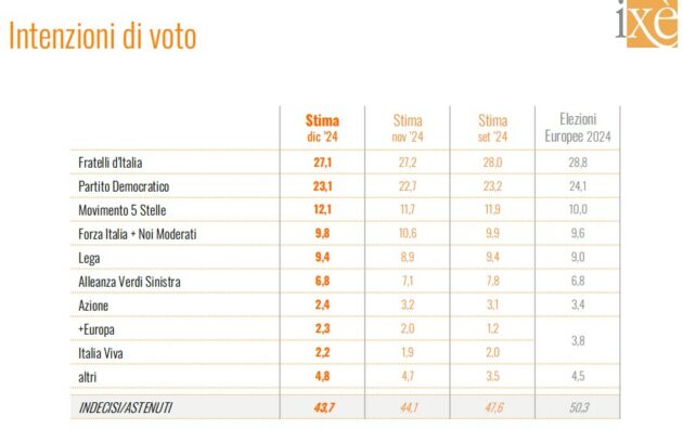 Frena Forza Italia che però resta – in questo quadro – la quarta forza politica, comunque davanti alla Lega. Nel contesto dell’ultimo mese secondo Ixè i forzisti sono in tendenza negativa, mentre i leghisti in lieve ascesa. L’Alleanza Verdi-Sinistra mantiene il ritmo dell’exploit delle Europee anche se segnala qualche cedimento, abbandonando la linea del 7 per cento e riposizionandosi su quella del 6. Sotto al 3 per cento sono tutti gli altri partiti centristi di opposizione: Azione perde quasi un punto in un mese, riprende qualche boccata d’ossigeno +Europa, risale di poco Italia Viva che comunque non va oltre l’area del 2 per cento. L’area del non voto – che comprende astenuti convinti e indecisi – resta tra il 43 e il 44.
