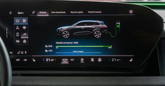 Quanto alla tecnologia a bordo, è molto interessante l’e-tron trip planner, un’estensione del navigatore che studia la strategia di ricarica più rapida a seconda dell’itinerario. Lo fa considerando diversi fattori, come il traffico, lo stile di guida, la disponibilità delle colonnine (riceve i dati in tempo reale dal 97% della rete) e la topografia del percorso. Di solito predilige la ricarica ad alta potenza, ma i criteri si possono personalizzare scegliendo il tipo di colonnina oppure impostando l’energia residua da mantenere.