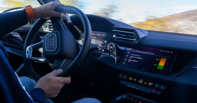 Per il resto, le sensazioni sono quelle di tutte le altre A3: l’abitacolo è molto curato, con soluzioni scenografiche come il tasto del volume a sfioramento e le bocchette di aerazione in alto vicino al volante. I due grandi display hanno una ottima velocità di risposta e tutta la vista sul cruscotto è molto appagante, da un lato per i materiali utilizzati dall’altro per la qualità generale di plastiche e comandi. La seduta è piuttosto bassa e sportiva, con le gambe abbastanza allungate e il volante quasi verticale.