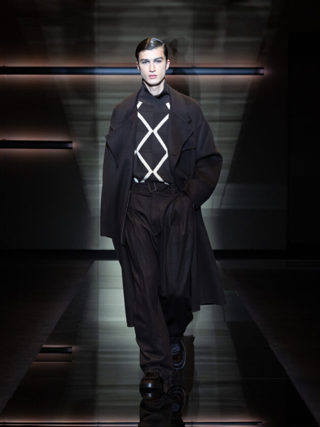 “Ho voluto creare una collezione allo stesso tempo vivace e misurata“, spiega il signor Armani. “Mi piace l’idea di giocare con elementi estremi, come il metallo e i maculati, i tessuti a pelo lungo e i broccati, sempre visti attraverso la mia personale visione dello stile, creando qualcosa di elegante, con personalità, dall’equilibrio singolare”. La passerella, dominata da una colonna-totem ruotante con il nome del brand e l’indirizzo dello store di via Manzoni 31, a Milano, si anima di “tante personalità e sfaccettature diverse“, come sottolinea lo stilista. Uomini impeccabili in lunghi cappotti e giacconi in tessuto a pelo lungo, abiti a tre pezzi con panciotto e catena, blazer con revers e spalle decise, in un’atmosfera che ricorda un club internazionale, un salotto cosmopolita.