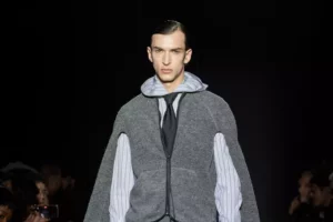 La funzionalità è il fulcro della collezione: jeans senza cuciture, parka e bomber che si trasformano in sciarpe imbottite o borse a tracolla grazie a tasche con zip, camicie con allacciature asimmetriche che si possono portare annodate al collo. Persino una giacca in lana gessata, aprendo le maniche, diventa una felpa con cappuccio. “Questi capi sono un invito a lasciarsi andare, a liberarsi dalle convenzioni per esplorare una nuova parte di sé”, spiega lo stilista, diplomato alla Central Saint Martins e con un passato da ballerino classico. a collezione esplora infatti la modularità, con capi trasformabili e un’ispirazione che attinge al workwear e al militare. Materiali come nylon riciclati, tessuti tecnici e traforati, e ripstop impermeabili dominano la collezione. Presentata anche “SLNSH”, la capsule collection realizzata in collaborazione con il brand di activewear Lululemon. “Il movimento è insito in ogni cosa” sottolinea Saul Nash, “e il concetto stesso di movimento è profondamente legato a quello di libertà”. Una filosofia che si traduce in una collezione che unisce performance e stile, per un’eleganza dinamica e contemporanea.