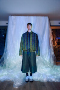 Ritorna ancora una volta il tema del viaggio, ma questa volta con una visione più astratta: Noskra è un brand milanese fondato dal ventottenne originario di Bari Andrea Lonigro, nato con una visione unisex – maschile ma genderless – e l’intento di essere prodotto strettamente in Italia. Il nome nasce da “una serata di estasi sensoriale”, vissuta mentre si trovava in Russia: la lettera “K” nel nome deriva dalla runa “Kenaz” nell’alfabeto runico; kenaz significa “fiaccola”, la luce in fondo al tunnel, la vita che si rinnova dopo la morte. Lonigro definisce il suo brand come un universo distopico e spazio stratto, un mondo di mezzo tra il reale e l’etereo creato dall’esperienza con una sensibilità profonda. Nel suo design si vedono ispirazioni all’arte contemporanea – in particolare alle opere audiovisive di Rioji Ikeda, annunciate come la chiave di lettura del marchio -, mentre elementi di architettura brutalista sono ripresi nelle stampe e le creazioni dell’architetto modernista Le Corbusier ispirano le maxi tasche tipiche del brand. Per l’autunno/inverno Noskra presenta “DNA”, una collezione che trasporta l’essenza della moda urbana in un ambiente naturale con capi funzionali ma dai tagli contemporanei. Tessuti traspiranti e tecnici – per questa collezione affiancati a maglieria di qualità – eco-sostenibili si tingono di tinte scure e neutre e si costruiscono nei tagli puliti di parka e pantaloni, ricchi di elementi funzionali e sartoriali come grosse tasche imbottite e tasche a scomparsa.