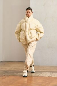 Rigore quasi militare, ma dal sapore gentile, per capi realizzati in nylon, mussola di cotone leggerissima, canvas dalla struttura più robusta e tela di cotone lavata e tinta in capo per un effetto vissuto. La palette cromatica è neutra e raffinata: avorio, fango, nero, grigio e sabbia caramello, con l’aggiunta di una stampa ispirata ai tappeti azeri per un tocco di ricercatezza. I pantaloni, attraversati lateralmente da zip, rivelano tasche e spazio extra quando aperte, per poi tornare a linee più asciutte e vicine al corpo una volta chiuse. Per la donna, Mordecai propone nuove silhouette in pashmina impalpabile, viscosa cupro e lana secca, declinate nei colori classici del brand a cui si aggiunge l’inedito “dune”. Una collezione che celebra la capacità di adattamento e l’apertura verso nuove prospettive, trasformando il movimento individuale in una forza collettiva, proprio come nella performance con cui è stata presentata.