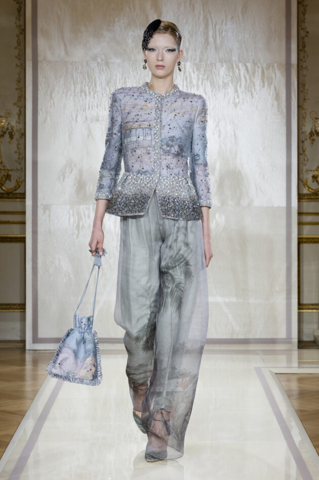 “La luce viaggia a una velocità tutta sua, attraversando epoche e pensieri, luoghi e fantasie”, si legge nelle note della collezione. Ed è proprio un viaggio, quello proposto da Armani, un percorso che tocca “i colori della Cina, i paesaggi della Polinesia che diventano stampe e ricami di acquerellata delicatezza, l’opulenza dell’India, l’eleganza lineare del Giappone, il decoro del Nord dell’Africa: in modo sempre impalpabile, appena percettibile. Come una pennellata di luce, appunto”, per usare le parole dello stilista.