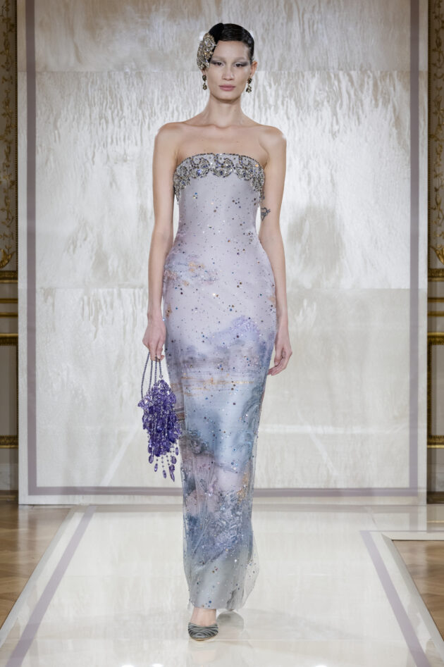 I ricami, realizzati a mano, sono un altro elemento chiave della collezione, pervadono tutto, culminando in un prezioso patchwork che omaggia il senso della decorazione indiana. Un dettaglio che, insieme ai piccoli copricapi intessuti in una rete di cristalli che adornano le teste delle modelle, conferisce alla donna Armani Privé un’allure di delicata opulenza, illuminata da una luce chiara, lunare. E non c’è dubbio che questi capi ultra-lavorati, visti sfilare negli spazi intimi di Palazzo Armani, finiranno presto tra le mani di chi vestirà le star di Hollywood agli Oscar 2025: non a caso in prima fila c’era, tra gli altri, Demi Moore, che ha incantato tutti con un look Privé agli ultimi Golden Globe.