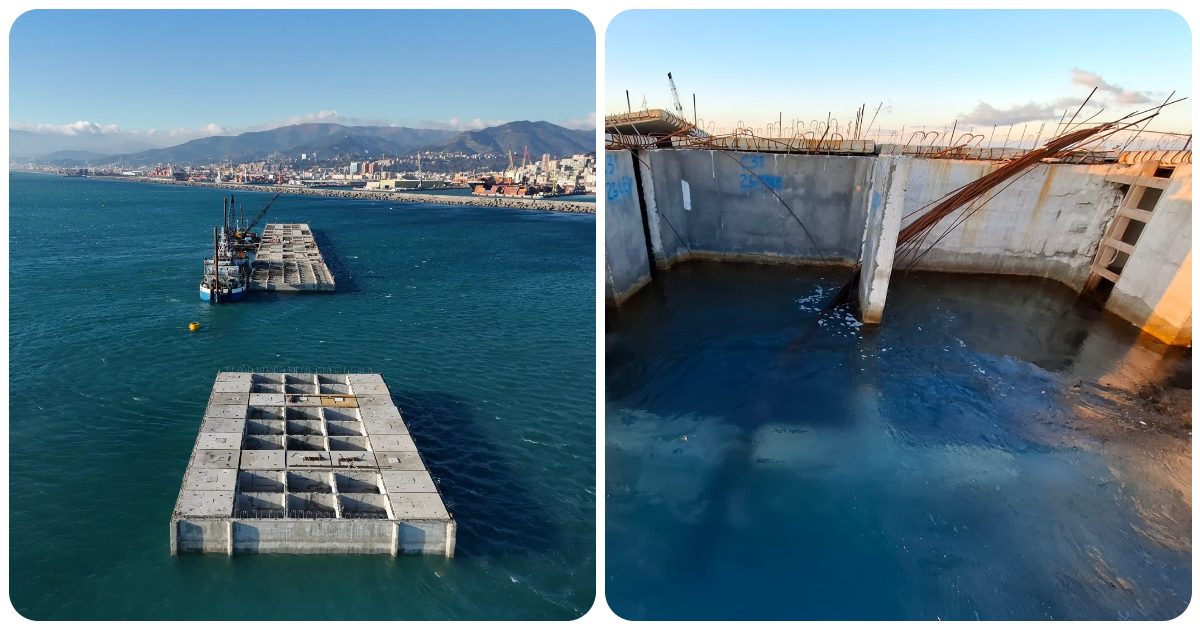 La prima immagine, scattata da WeBuild, capofila della cordata appaltatrice, pochi giorni prima della mareggiata, mostra i cassoni della diga integri. Dopo il fortunale la società ha diffuso una nota: “Un cassone ha subito danni in una porzione della sua parte superiore, durante le operazioni di riempimento. I cassoni, che non hanno subito alcun ulteriore danno, sono stabili nella loro posizione di progetto. La riparazione dei danni subiti nelle finestre ‘smorza onde’ che non hanno una funzione strutturale per la stabilità del cassone, non impatta in alcun modo sul regolare svolgimento delle lavorazioni programmate”.
