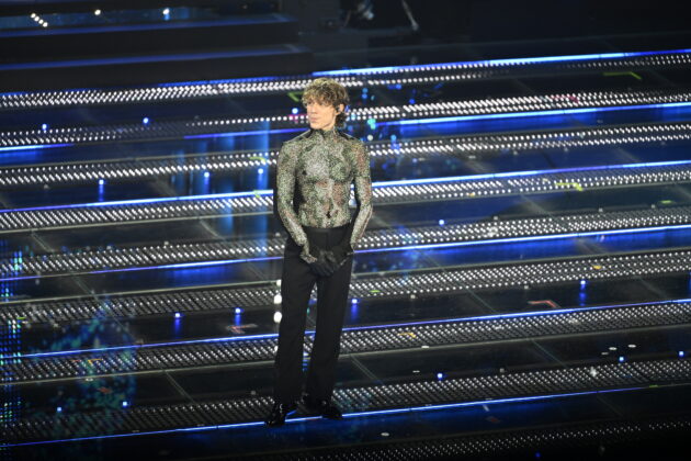 Look: Il trompe-l’œil effetto pettorali l’ha già sfoggiato Chiara Ferragni nel lontano 2021 ma, certo, fa sempre la sua scena soprattutto se, come in questo caso, è meno evidente. La maglia tempestata di strass sui toni del verde, dell’argento e del bronzo emana bagliori sotto i fari dell’Ariston e rende ancora più suggestiva la sua performance. Troppo ad effetto per non essere stata studiata a tavolino…