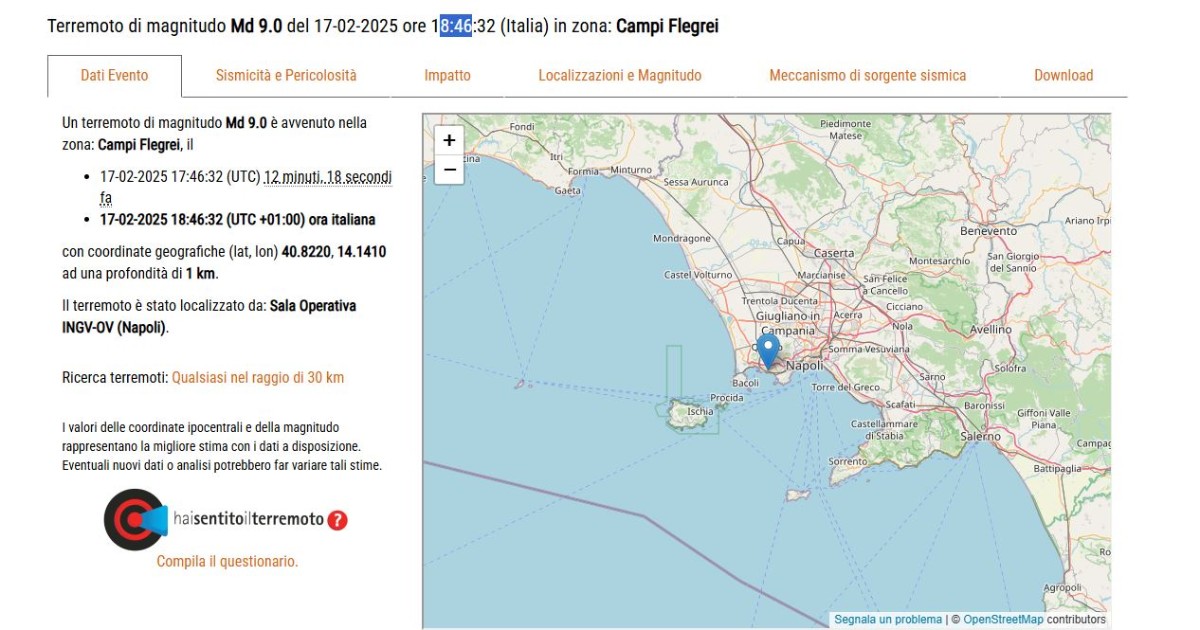 Un errore può capitare a tutti, anche l’Istituto Nazionale di geofisica e vulcanologia, gli scienziati che puntualmente monitorano e aggiornano la popolazione italiana sui terremoti che avvengono nel nostro Paese e in tutto il mondo. Certo, quello che è accaduto nel pomeriggio di lunedì 17 febbraio sul sito e sul profilo X dell’Ingv avrà fatto balzare dalla sedia più di qualcuno. Alle 18.54 è comparso un post che indicava un “terremoto di magnitudo 9 ai Campi Flegrei” alle 18.46.