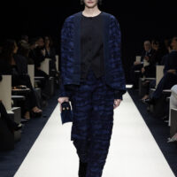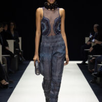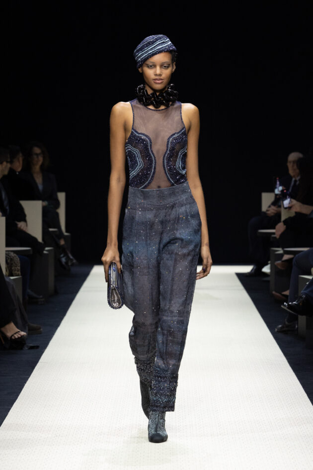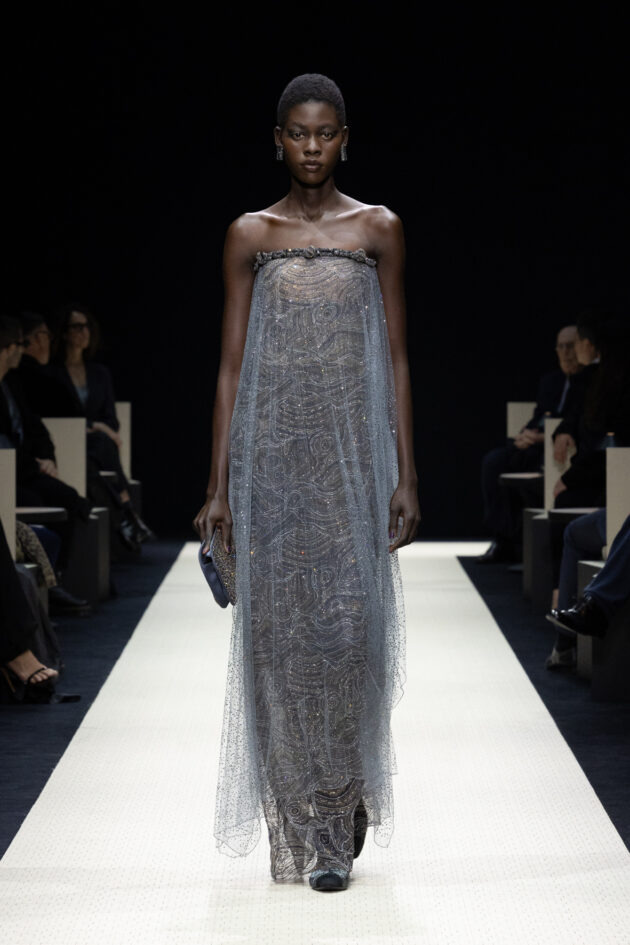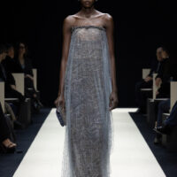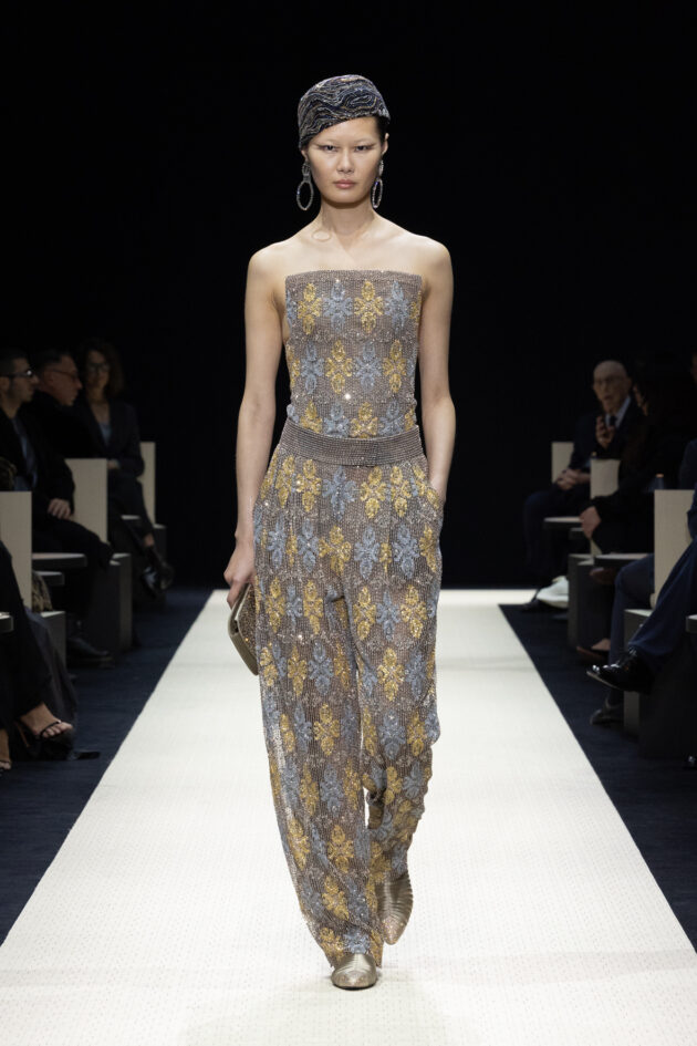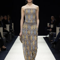 È la sera, però, a rivelare il lato più spettacolare della collezione. Gli abiti si fanno impalpabili, preziosi come gemme, illuminati da ricami scintillanti come cristalli di pietra lavica. Tuniche di cristalli e pantaloni sottili, veli che sovrastano abiti sottoveste, top strutturati che brillano come minerali. Una femminilità misteriosa e intoccabile, quella immaginata da Armani, che sembra emergere dalle profondità della terra. Sono creazioni preziose che strizzano l’occhio alla couture ma progettate con quella pragmaticità che fa sì che possano essere realizzate in serie, per regalare quell’idea di sogno tipica dell’alta moda che riaccende il desiderio sopito di molte amanti (e clienti) della moda. L’armonia si ritrova nella palette di colori, che spazia dai toni sabbiosi e dorati all’intensità dei marroni e dei verdi, fino ai bagliori del blu quarzo e del greige galenite.