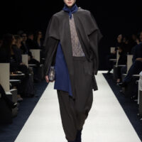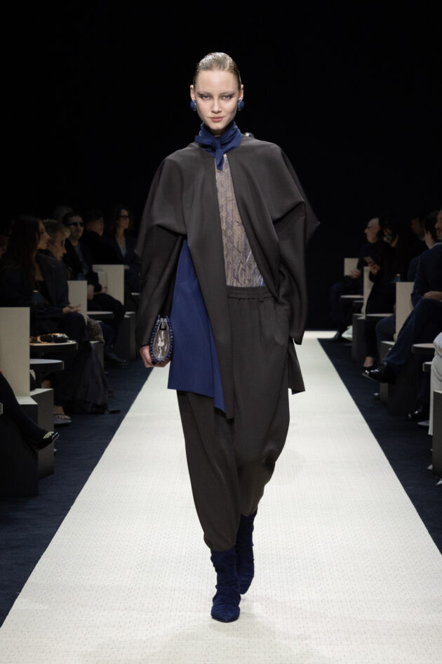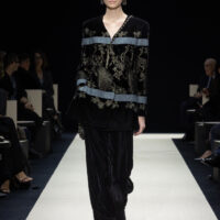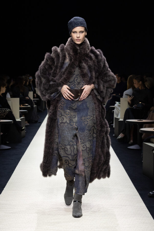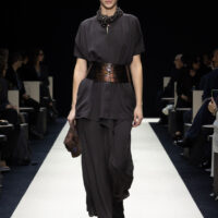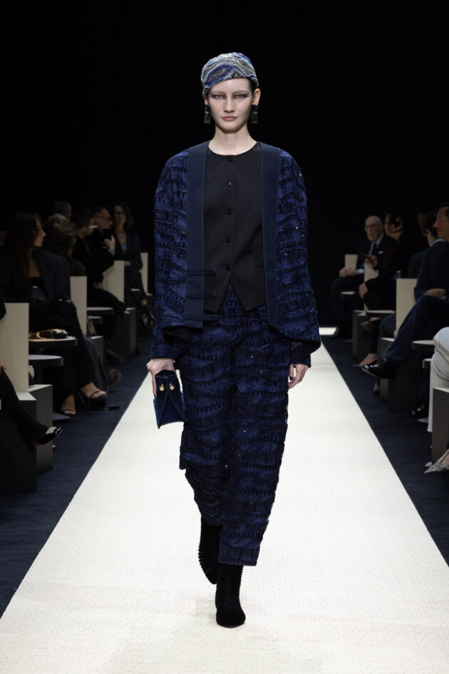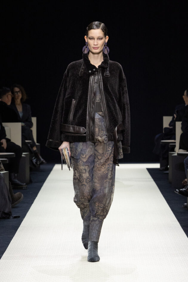 Ecco allora sfilare linee fluide e morbide, che accarezzano il corpo senza costringerlo. Pantaloni che si aprono in “foglie di tessuto”, come maxi plissé che si richiudono alla caviglia, infilandosi in stivaletti stringati. Giacche dal taglio impeccabile, ma rese più morbide dai tessuti: velluti, cashmere, sete jacquard. Cappotti lunghi e decostruiti, preziosi, o doppiopetto, stretti in vita e proposti nei toni caldi della terra. Maxi cinture che sembrano minerali lavorati, a segnare la silhouette. E poi, gli echi di terre lontane, di un Oriente e di un Sud del mondo che si fondono in una visione senza tempo, come sottolinea lo stesso stilista: uno stile “senza tempo e senza luogo, un sempre e ovunque”. Un’ispirazione che si traduce in ricami preziosi, in collane maxi, in dettagli che rimandano a culture diverse, ma che si armonizzano perfettamente nell’inconfondibile stile Armani.