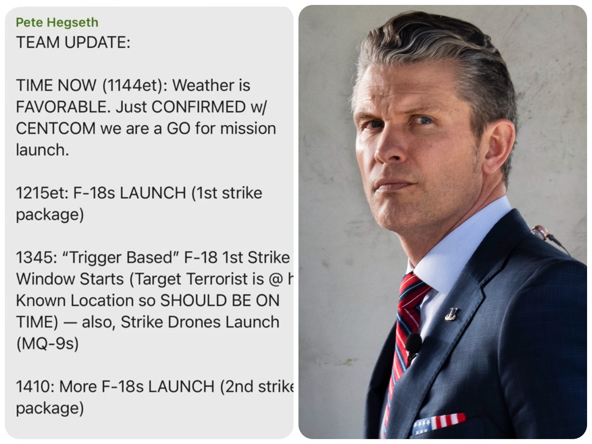 I messaggi portano la firma del segretario alla Difesa Pete Hegseth, che li condivide nella chat non protetta “Houthi PC small group” quando l’operazione non è ancora iniziata. “Alle 11:44 ora orientale, Hegseth ha pubblicato nella chat, in maiuscolo, “AGGIORNAMENTO SQUADRA”, riporta il giornalista. “ORA ORA (1144et): Meteo FAVOREVOLE. Appena CONFERMATO con CENTCOM (comando dell’esercito Usa in Medio Oriente, ndr) siamo pronti per il lancio della missione”, scrive ancora il capo del Pentagono. Che poi fornisce alcuni dettagli della missione: “1215et: LANCIO F-18 (pacchetto 1° attacco)”; “1345: Inizia la finestra di primo attacco dell’F-18 ‘Trigger Based’ (il terrorista bersaglio si trova nella sua posizione nota, quindi DOVREBBE ESSERE IN ORARIO, inoltre, lancio dei droni d’attacco (MQ-9)”.