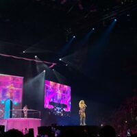 La cifra distintiva del tour, infatti, è una certa allegria scanzonata da serata tra ragazze in cui si si parla, ovviamente, di uomini. La musica di Sabrina Carpenter – e quindi lo show – è piena di allusioni sessuali espresse in modo brillante, civettuolo e ironico. Il suo guardaroba include giarrettiere e baby-doll, si esibisce su un letto gigante ripresa da quella sembra una camera e chiede al pubblico di cantare con lei i versi di Nonsense: “Quando ti guardo dico cose senza senso/ Parlo di farlo tutto il giorno/ Spero che nessuno bussi”. Nonostante abbiamo visto l’intero tour spezzettato su TikTok, il pubblico impazzisce comunque quando si rotola sul letto cantando Bed Chem: “Sei libero la prossima settimana? Perché penso che avremmo un’ottima chimica a letto”.