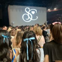 Eppure, sorprendentemente, il concerto è pieno di bambine accompagnate dai genitori. È facile riconoscere la congrega dei fan che sciama verso il Forum di Assago: è una marea vestita di rosa. Sulla metro spuntano cappelli da cowboy, minigonne a balze, calzini con i merletti e soprattutto tanti, tantissimi fiocchi sui capelli. Ormai vestirsi a tema è parte dell’esperienza di un concerto e i fan fanno a gara per replicare gli outfit dell’artista: corsetti rossi, sottovesti color pastello, abiti con i cuori ritagliati. Appena arrivata sperimento il primo rituale del concerto: i tatuaggi temporanei a forma di bacio, uno dei simboli dell’estetica della popstar. Sono quelli che facevamo da bambini trasferendoli dal cartoncino alla pelle con un po’ d’acqua: le persone li scambiano e li regalano in giro, che è anche un ottimo modo per fare amicizia. Chi, come me, arriva da solo non resta solo a lungo: nella grande tribù di Sabrina Carpenter è facile essere adottati da qualche gruppo, farsi complimenti per i vestiti, prestarsi un rossetto in bagno o i fazzoletti. Insomma, fare amicizia.