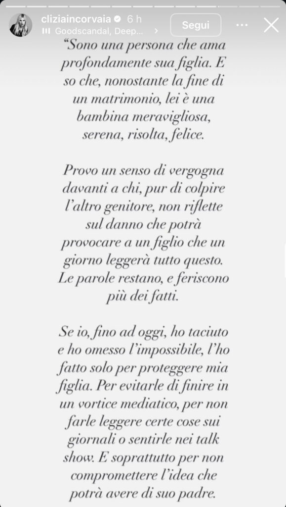 Incorvaia ha esordito così: “Sono una persona che ama profondamente sua figlia. E so che, nonostante la fine di un matrimonio, lei è una bambina meravigliosa, serena, risolta, felice”. Poi ha affermato di provare “un senso di vergogna davanti a chi, pur di colpire l’altro genitore, non riflette sul danno che potrà provocare a un figlio che un giorno leggerà tutto questo”. “Le parole restano, e feriscono più dei fatti. Se io, fino ad oggi, ho taciuto e ho omesso l’impossibile, l’ho fatto solo per proteggere mia figlia. Per evitarle di finire in un vortice mediatico, per non farle leggere certe cose sui giornali o sentirle nei talk show. E soprattutto per non compromettere l’idea che potrà avere di suo padre”, ha proseguito.