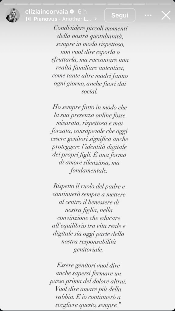 Ha concluso dichiarando che riconoscerà sempre l’importanza dell’ex marito nel percorso di crescita di Nina: “Rispetto il ruolo del padre e continuerò sempre a mettere al centro il benessere di nostra figlia, nella convinzione che educare all’equilibrio tra vita reale e digitale sia oggi parte della nostra responsabilità genitoriale. Essere genitori vuol dire anche sapersi fermare un passo prima del dolore altrui. Vuol dire amare più della rabbia. E io continuerò a scegliere questo, sempre”.