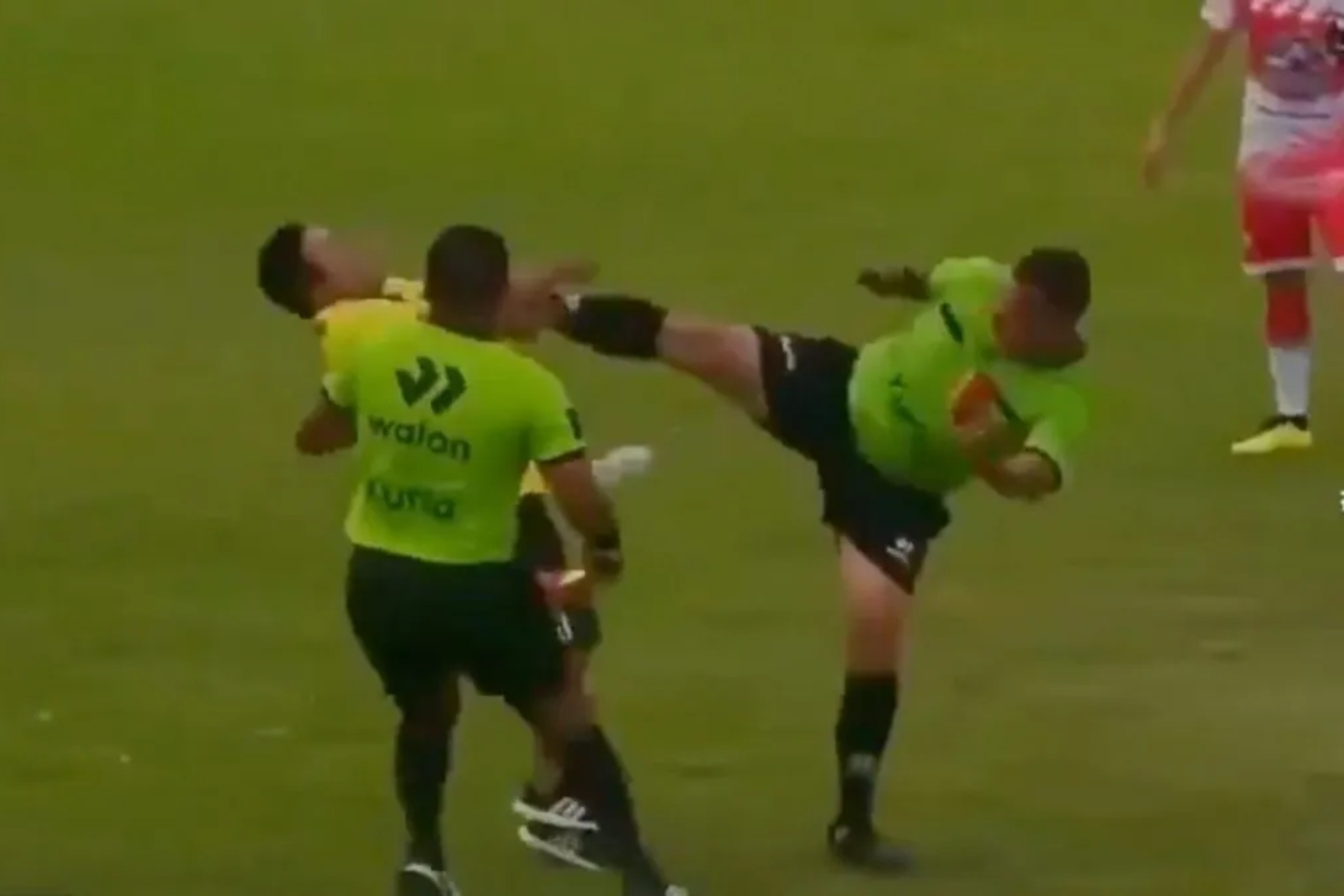 Il direttore di gara ha perso la testa rifilando un calcio nel petto a un membro dello staff di una delle due squadre. Si è scatenata una maxi-rissa