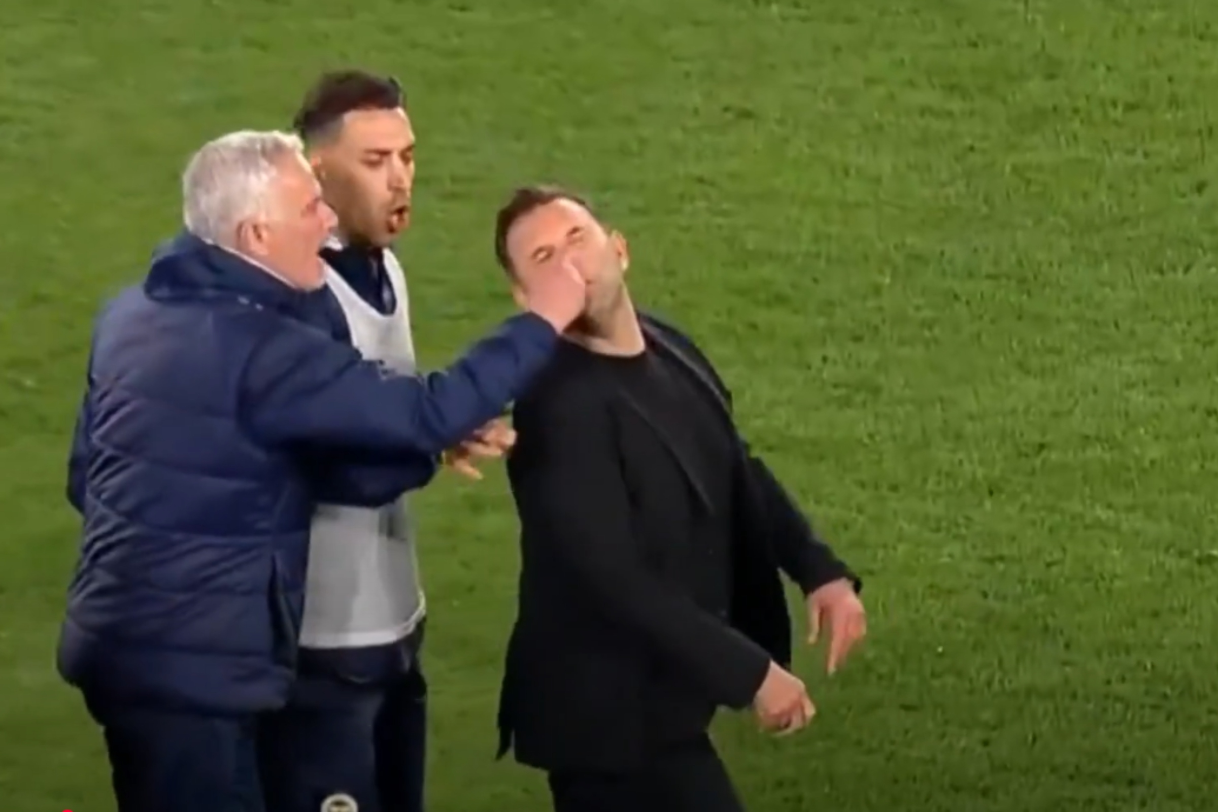Follia di Jose Mourinho, che ha strizzato il naso dell’allenatore del Galatasaray, Okan Buruk, dopo che il suo Fenerbahce è stata eliminato dalla Coppa di Turchia al termine di un infuocato derby di Istanbul che ha portato anche all’espulsione di 3 calciatori. In un video ampiamente condiviso sui social media, si nota Mourinho che allunga la mano verso il suo avversario per afferrargli il naso. Buruk cade quindi a terra tenendosi il viso prima che il portoghese venga fatto allontanare. Il Galatasaray ha vinto la gara valida per i quarti di finale 2-1 e subito dopo ha pubblicato una foto sul suo account ufficiale X di un sorridente Buruk che guarda nella direzione di Mourinho.