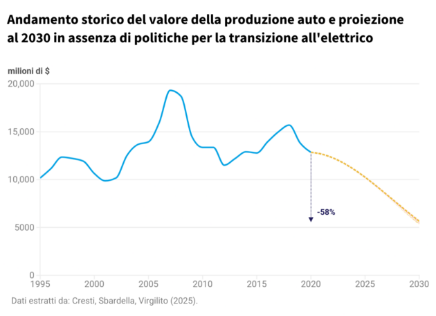 Senza politiche industriali e misure di stimolo economico per l’industria dell’auto italiana, mirate alla transizione alla mobilità elettrica, al 2030 il valore della produzione del comparto potrebbe registrare un calo del 56-58%. Il costo dell’inazione? Fino a 7,49 miliardi di dollari. È quanto emerge dallo studio “L’industria automobilistica e la transizione alla mobilità elettrica in Italia”, commissionato dal think tank Ecco e da Transport and Environment (T&E) a un gruppo di economisti della Scuola Superiore Sant’Anna di Pisa e del Centro Ricerche Enrico Fermi di Roma. Si esplorano i possibili impatti economici, industriali e sociali del declino della produzione nazionale di auto, mentre a livello globale il settore è impegnato nella transizione verso l’elettrico. Si parte al dato attuale: l’industria dell’auto italiana affronta oggi un calo prolungato della produzione di veicoli (310mila unità nel 2024, -85% rispetto al picco di 2 milioni di veicoli prodotti nel 1989), con ripercussioni significative sulle industrie collegate. Gli effetti della mancanza di politiche lungimiranti vengono quantificati in diversi scenari, a seconda dell’intervento dello Stato con misure di sostegno al reddito (intervento basso, medio e alto) e della diversa capacità di riassorbimento dei lavoratori in altri comparti.