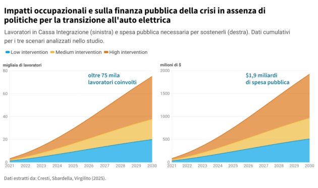 Nello studio Maria Enrica Virgillito della Scuola Superiore Sant’Anna di Pisa e Angelica Sbardella e Lorenzo Cresti del Centro di Ricerche Enrico Fermi di Roma hanno elaborato un’analisi con tre scenari. In quello più prudenziale (low intervention) si ipotizza che il 65% dei lavoratori in esubero venga reimpiegato in altri settori, che il 35% acceda alla cassa integrazione e che il 5% rimanga disoccupato. Al 2030 si registra una perdita di valore della produzione di 7,24 miliardi e di consumo di automobili 4,42 miliardi di dollari (-56% rispetto al 2020). I lavoratori persi sono 66.400, di cui 24.600 direttamente impiegati nel settore dell’auto (-65% rispetto al 2020) e 41.800 nel resto della filiera (-54%). Nel corso di 10 anni, il costo della cassa integrazione a copertura di 20mila lavoratori costerebbe allo Stato 510 milioni di dollari.