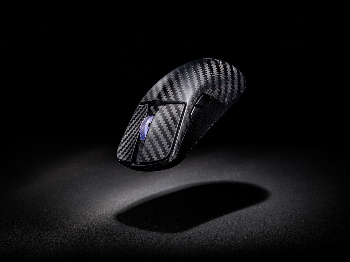 Il primo aspetto che colpisce dell’Harpe Ace Extreme è il peso: solo 47 grammi. ASUS ha optato per una scocca in fibra di carbonio, un materiale che non solo riduce la massa del dispositivo, ma garantisce anche un’estetica unica e una resistenza superiore rispetto alla plastica tradizionale. Il design è minimalista e completamente simmetrico, rendendolo adatto sia a destrimani che a mancini, anche se la disposizione dei pulsanti laterali potrebbe risultare meno intuitiva per questi ultimi.