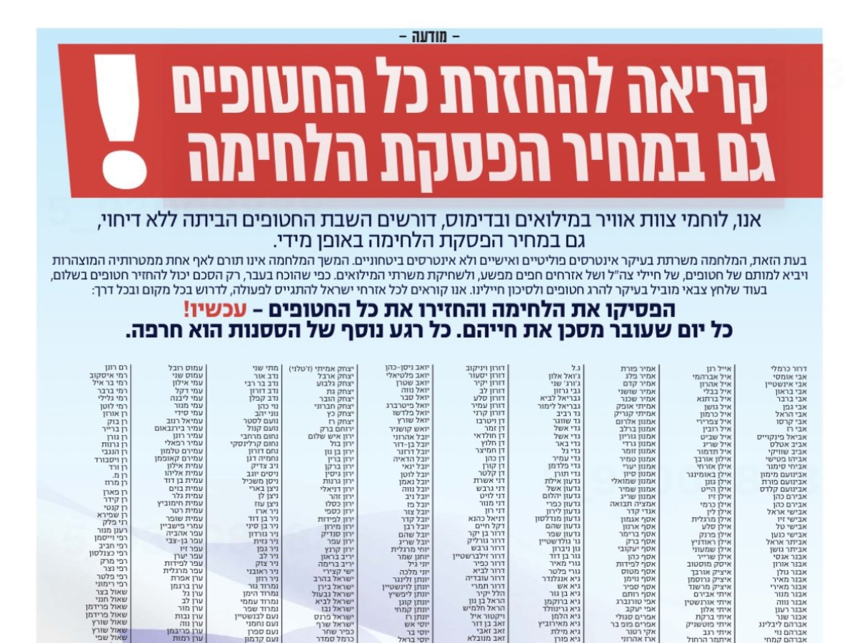 Una lettera per chiedere al governo di accettare un accordo con Hamas per la restituzione dei 59 ostaggi ancora nelle mani dell’organizzazione, anche a costo di fermare la guerra a Gaza che ora serve a soddisfare “interessi politici e personali” più che alla sicurezza nazionale. L’hanno firmata circa mille tra riservisti e ufficiali in pensione della Israeli Air Force, tra cui l’ex capo di stato maggiore delle Israele Defense Forces e comandante delle Iaf Dan Halutz e Nimrod Sheffer, ex capo della direzione della pianificazione delle forze armate. “Il proseguimento della guerra – si legge nella missiva pubblicata da diversi quotidiani – non garantisce il raggiungimento di nessuno degli obiettivi dichiarati e causerà la morte degli ostaggi, di soldati delle Idf e di civili innocenti“. “Come dimostrato in passato – prosegue i testo -, solo un accordo è in grado di garantire la restituzione in sicurezza dei rapiti, mentre la pressione militare porta principalmente alla loro uccisione e mette in pericolo i nostri soldati”. “Fermiamo gli scontri e restituiamo tutti gli ostaggi, subito!”, si dice ancora, perché “ogni giorno che passa mette a repentaglio le loro vite”.