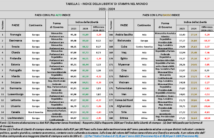 L’Europa anche nel 2024, rispetto al 2023, nonostante qualche flessione o miglioramento, può definirsi il Continente campione della Libertà di stampa: i primi 15 Paesi nel mondo con Indice più alto sono tutti del vecchio continente; di contro, solo uno (Bielorussia, 167esimo posto in graduatoria) è europeo tra quelli con minore Libertà di stampa. Fra questi ultimi l’Asia vanta il record negativo con 11 Paesi su 15, seguita dall’Africa con 2, dei quali l’Eritrea occupa l’ultimo posto (Tab. 1).