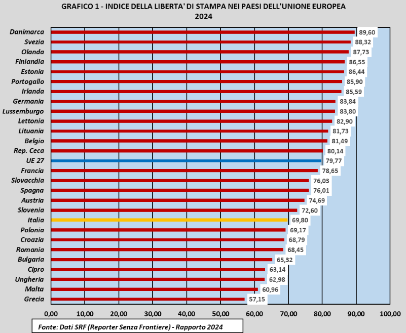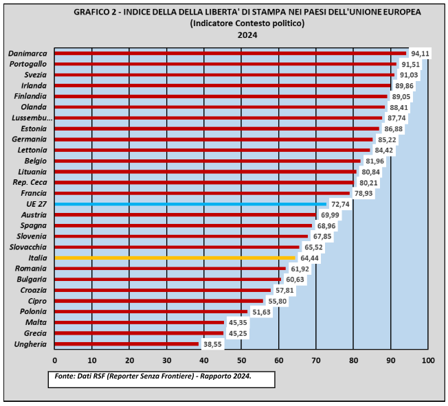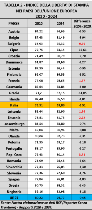 Tra il 2020 e il 2024 (Tab. 2), l’Indice è diminuito: il range tra il primo e l’ultimo è passato da 92,07 (Finlandia) e 69,16 (Ungheria) a 89,6 (Danimarca) e 57,15 (Grecia). Anche se la media tra i 2 anni è variata poco (-0,45), si è ampliato il gap tra Paesi, con l’aggravante che quelli che si trovavano ai livelli più bassi per Libertà di stampa hanno registrato le maggiori variazioni negative (Cipro, Grecia, Malta, Ungheria), mentre, in totale, solo 5 Paesi su 27 hanno migliorato il proprio Indice. Anche l’Italia è peggiorata sensibilmente (-6,51).