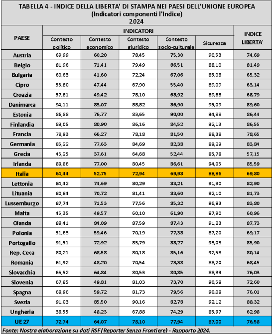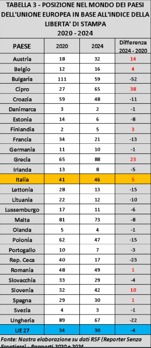 Come rilevato, tuttavia, l’Ue è un’oasi felice (Tab. 3): se distribuissimo i 180 Paesi considerati in 3 fasce di 60 Stati ciascuna, denominandole ad alta, media e bassa Libertà di stampa, l’81% dei membri Ue nel 2020 e l’85% nel 2024, si collocherebbe nella prima e il restante nella seconda.